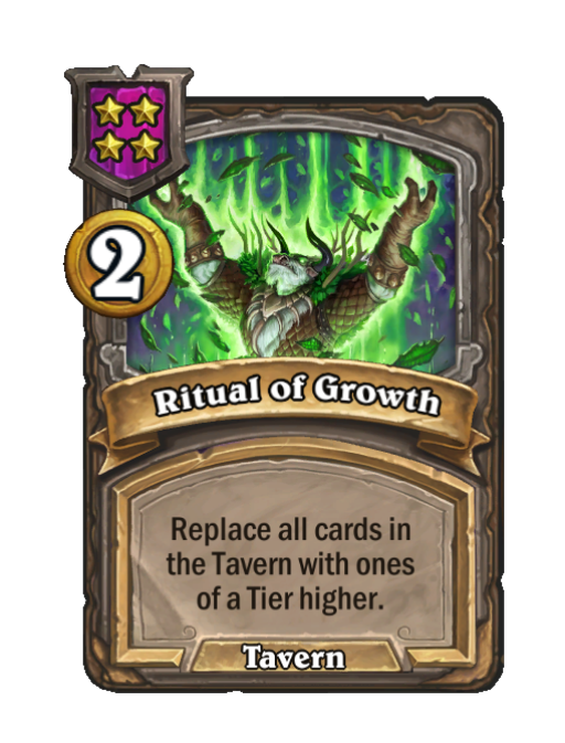 Ritual of Growth is a Tier 4 Spell in Hearthstone Battlegrounds (Tavern). Effect: Replace all cards in the Tavern with ones of a Tier higher. Costs 2 Gold. This card is no longer in the pool (Legacy).