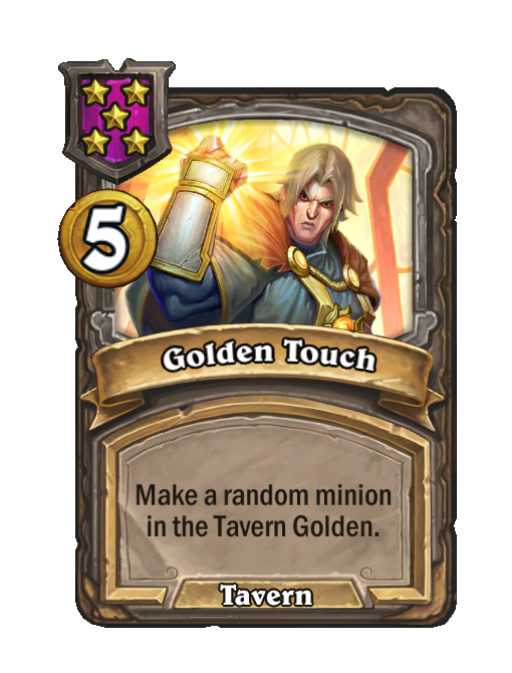 Golden Touch is a Tier 5 Spell in Hearthstone Battlegrounds (Tavern). Effect: Make a random minion in the Tavern Golden. Costs 5 Gold.