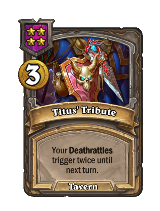 Titus' Tribute is a Tier 4 Spell in Hearthstone Battlegrounds (Tavern). Effect: Your Deathrattles trigger twice until next turn. Costs 3 Gold. This card is no longer in the pool (Legacy).