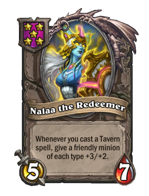 Nalaa the Redeemer is a Tier 5 Minion in Hearthstone Battlegrounds with 5/7 stats. Effect: Whenever you cast a Tavern spell, give a friendly minion of each type +3/+2.