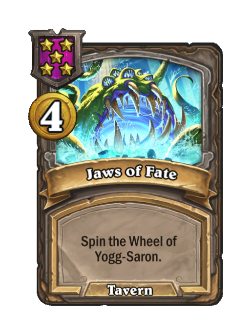 Jaws of Fate is a Tier 5 Spell in Hearthstone Battlegrounds (Tavern). Effect: Spin the Wheel of Yogg-Saron. Costs 4 Gold. This card is no longer in the pool (Legacy).