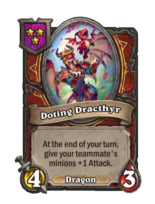 Doting Dracthyr is a Tier 3 Dragon Minion in Hearthstone Battlegrounds with 4/3 stats featuring End of Turn. Effect: At the end of your turn, give your teammate's minions +1 Attack.