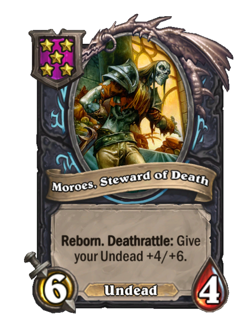 Moroes, Steward of Death is a Tier 5 Undead Minion in Hearthstone Battlegrounds with 6/4 stats featuring Deathrattle, Reborn. Effect: Reborn. Deathrattle: Give your Undead +4/+6. This card is no longer in the pool (Legacy).