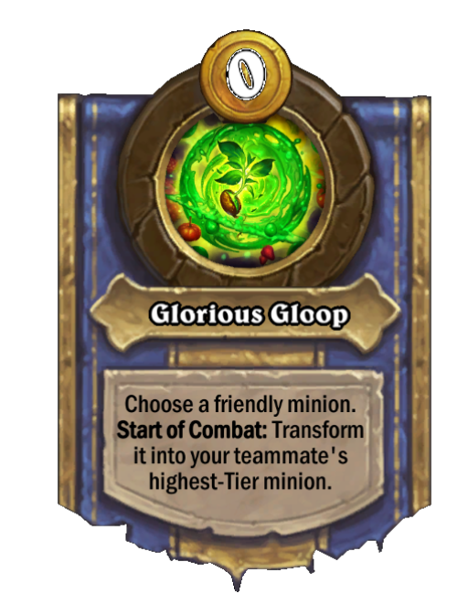 Glorious Gloop is a Hero Power in Hearthstone Battlegrounds. Effect: Choose a friendly minion. Start of Combat: Transform it into your teammate's highest-Tier minion. Created by: Flobbidinous Floop.