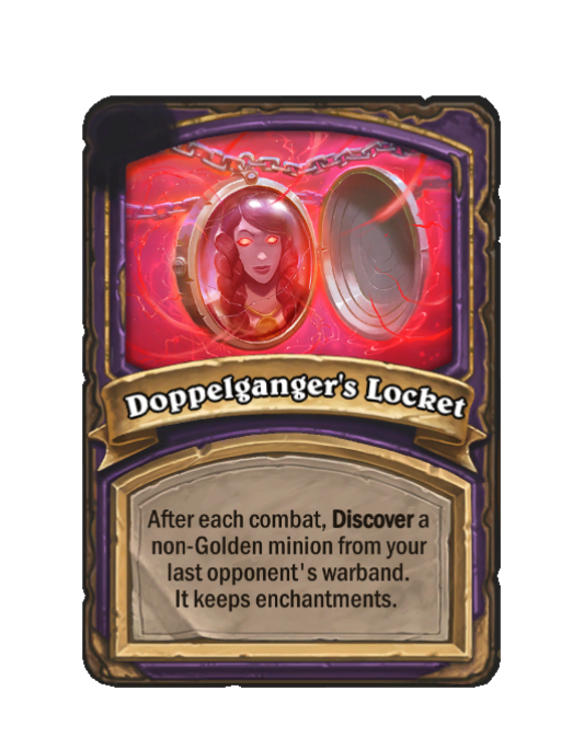 Doppelganger's Locket is a Reward in Hearthstone Battlegrounds featuring Discover. Effect: After each combat, Discover a non-Golden minion from your last opponent's_warband. It keeps enchantments.
