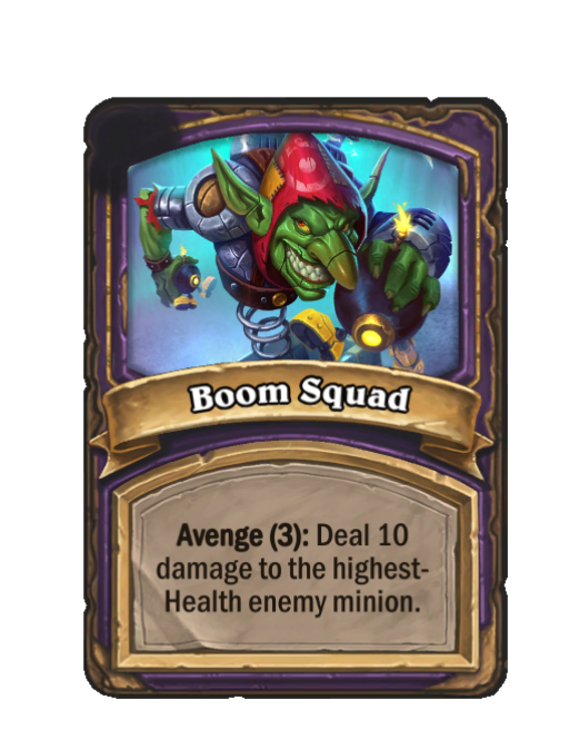 Boom Squad is a Reward in Hearthstone Battlegrounds featuring Avenge. Effect: Avenge (3): Deal 10 damage to the highest-Health enemy minion. This card is no longer in the pool (Legacy).