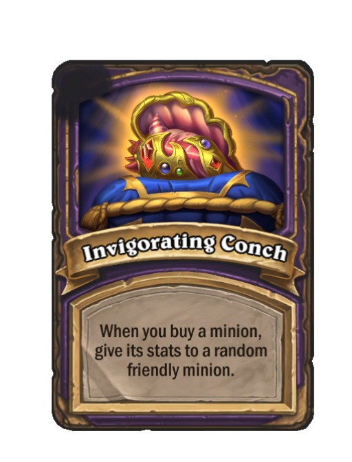 Invigorating Conch is a Reward in Hearthstone Battlegrounds. Effect: When you buy a minion, give its stats to a random friendly minion. This card is no longer in the pool (Legacy).