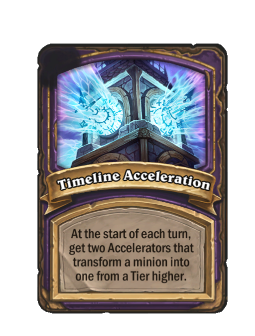 Timeline Acceleration is a Reward in Hearthstone Battlegrounds featuring Start of Turn. Effect: At the start of each turn, get two Accelerators that transform a minion into one from a Tier higher.
