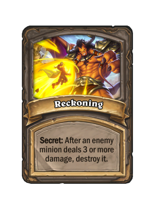Reckoning is a Spell in Hearthstone Battlegrounds featuring Secret. Effect: Secret: After an enemy minion deals 3 or more damage, destroy it.
