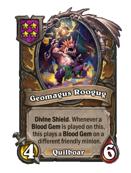 Geomagus Roogug is a Tier 4 Quilboar Minion in Hearthstone Battlegrounds with 4/6 stats featuring Divine Shield. Effect: Divine Shield. Whenever a Blood Gem is played on this, this plays a Blood Gem on a __different friendly minion.