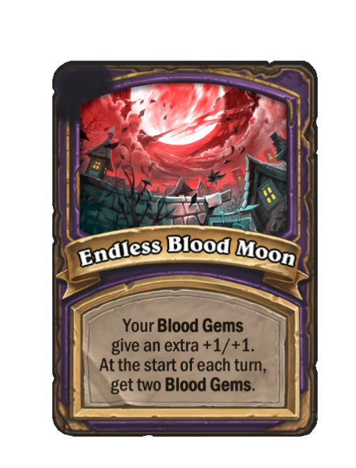 Endless Blood Moon is a Reward in Hearthstone Battlegrounds featuring Start of Turn. Effect: Your Blood Gems give an extra +1/+1. At the start of each turn, get two Blood Gems. This card is no longer in the pool (Legacy).