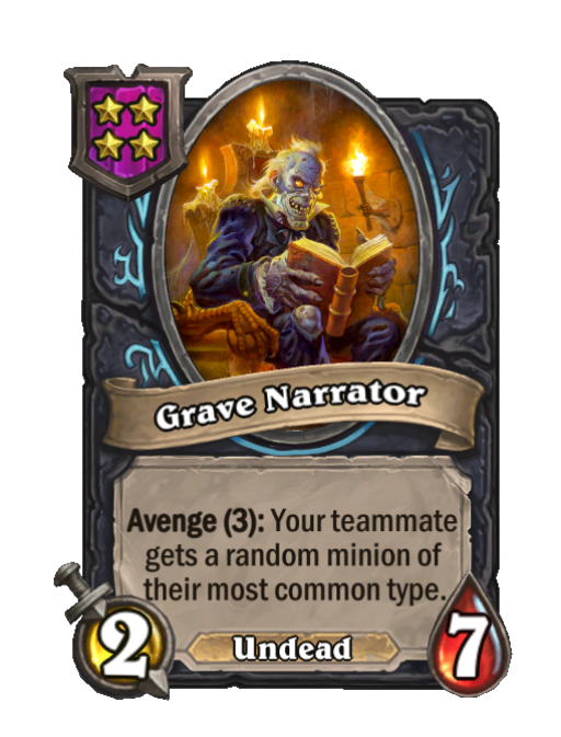 Grave Narrator is a Tier 4 Undead Minion in Hearthstone Battlegrounds with 2/7 stats featuring Avenge. Effect: Avenge (3): Your teammate gets a random minion of _their most common type.