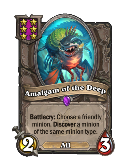 Amalgam of the Deep is a Tier 6 All Minion in Hearthstone Battlegrounds with 2/3 stats featuring Battlecry, Discover. Effect: Battlecry: Choose a friendly minion. Discover a minion of the same minion type. This card is no longer in the pool (Legacy).