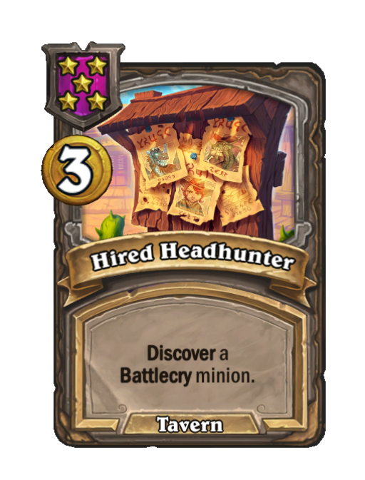 Hired Headhunter is a Tier 5 Spell in Hearthstone Battlegrounds featuring Discover (Tavern). Effect: Discover a Battlecry minion. Costs 3 Gold.