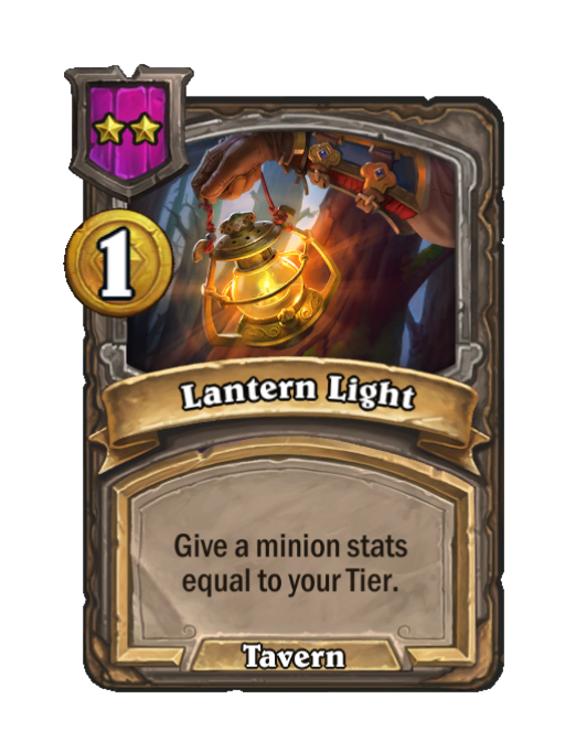 Lantern Light is a Tier 2 Spell in Hearthstone Battlegrounds (Tavern). Effect: Give a minion stats equal to your Tier. Costs 1 Gold. This card is no longer in the pool (Legacy).