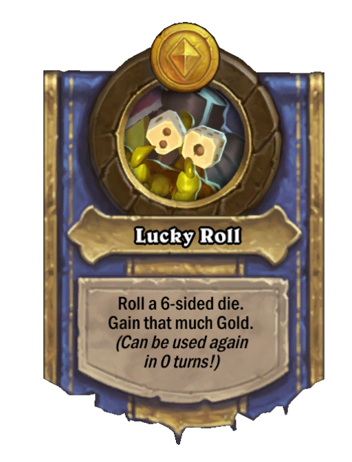 Lucky Roll is a Hero Power in Hearthstone Battlegrounds. Effect: Roll a 6-sided die. Gain that much Gold. (Can be used again in 0 turns!). Created by: Lucky Roll.