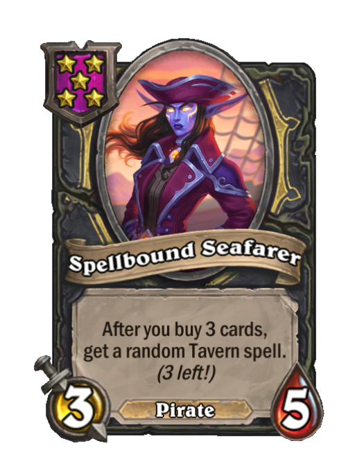 Spellbound Seafarer is a Tier 5 Pirate Minion in Hearthstone Battlegrounds with 3/5 stats. Effect: After you buy 3 cards, get a random Tavern spell. (3 left!). This card is no longer in the pool (Legacy).