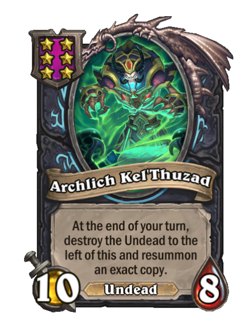 Archlich Kel'Thuzad is a Tier 6 Undead Minion in Hearthstone Battlegrounds with 10/8 stats featuring End of Turn. Effect: At the end of your turn, destroy the Undead to the left of this and resummon an exact copy. This card is no longer in the pool (Legacy).