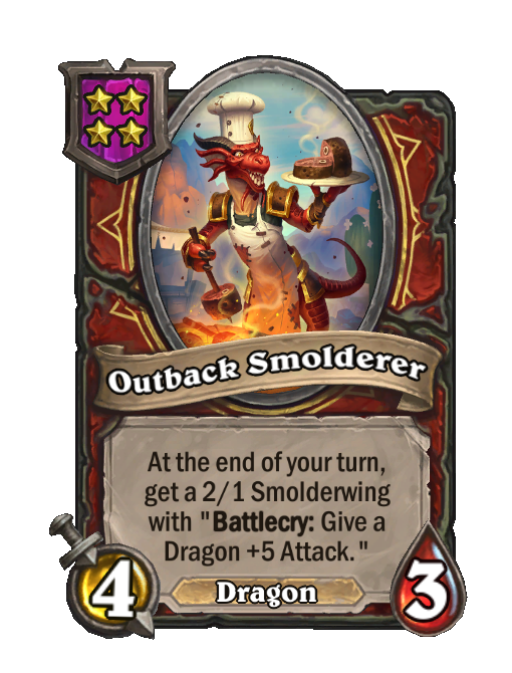 Outback Smolderer is a Tier 4 Dragon Minion in Hearthstone Battlegrounds with 4/3 stats featuring End of Turn. Effect: At the end of your turn, get a 2/1 Smolderwing with "Battlecry: Give a Dragon +5 Attack.". This card is no longer in the pool (Legacy).