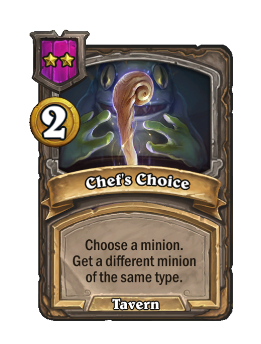Chef's Choice is a Tier 2 Spell in Hearthstone Battlegrounds (Tavern). Effect: Choose a minion. Get a different minion of the same type. Costs 2 Gold.
