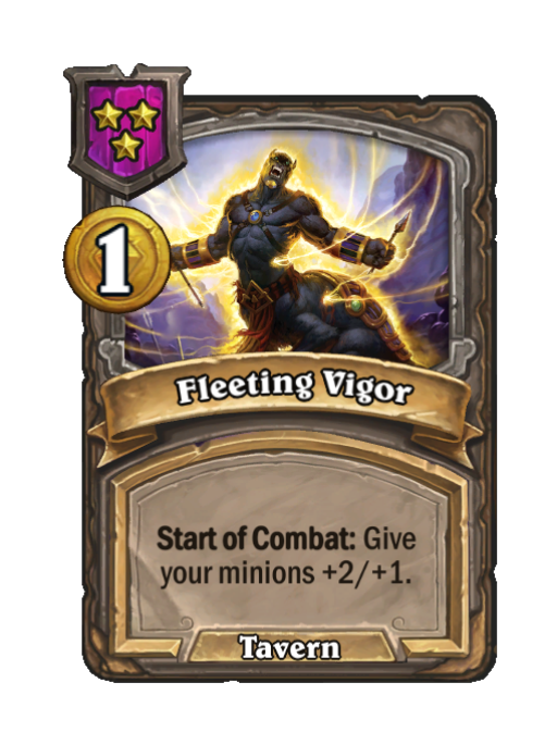 Fleeting Vigor is a Tier 3 Spell in Hearthstone Battlegrounds featuring Start of Combat (Tavern). Effect: Start of Combat: Give your minions +2/+1. Costs 1 Gold.