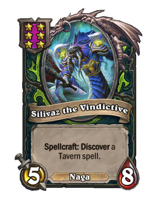 Silivaz the Vindictive is a Tier 6 Naga Minion in Hearthstone Battlegrounds with 5/8 stats featuring Spellcraft. Effect: Spellcraft: Discover a Tavern spell. This card is no longer in the pool (Legacy).
