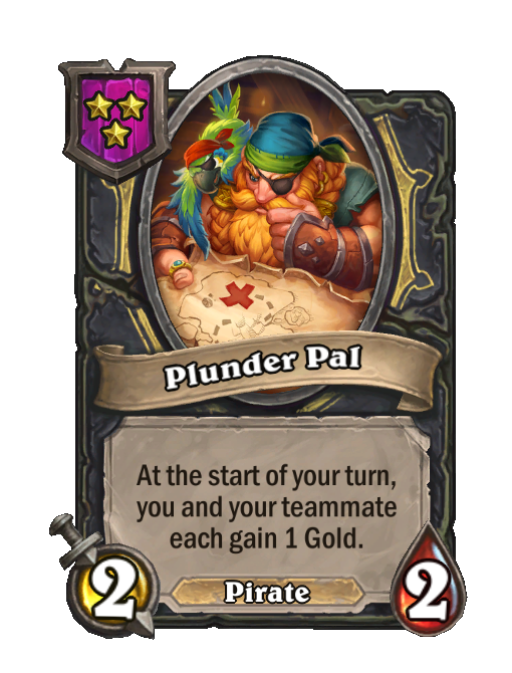 Plunder Pal is a Tier 3 Pirate Minion in Hearthstone Battlegrounds with 2/2 stats featuring Start of Turn. Effect: At the start of your turn, you and your teammate each gain 1 Gold.