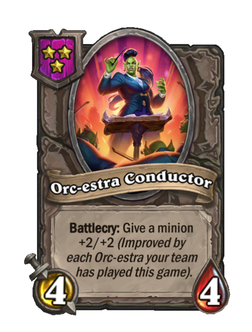 Orc-estra Conductor is a Tier 3 Minion in Hearthstone Battlegrounds with 4/4 stats featuring Battlecry. Effect: Battlecry: Give a minion +2/+2 (Improved by each Orc-estra your team __has played this game).
