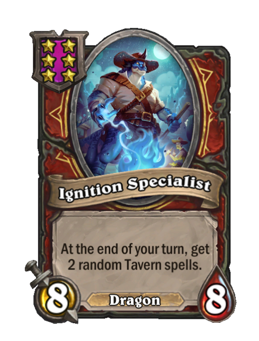 Ignition Specialist is a Tier 6 Dragon Minion in Hearthstone Battlegrounds with 8/8 stats featuring End of Turn. Effect: At the end of your turn, get 2 random Tavern spells.