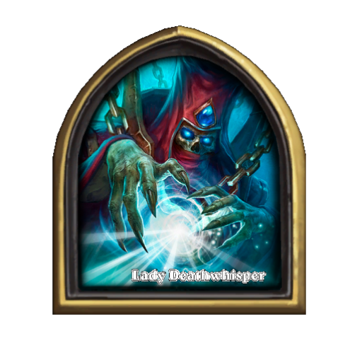 Lady Deathwhisper is a Hero in Hearthstone Battlegrounds. This card is no longer in the pool (Legacy).