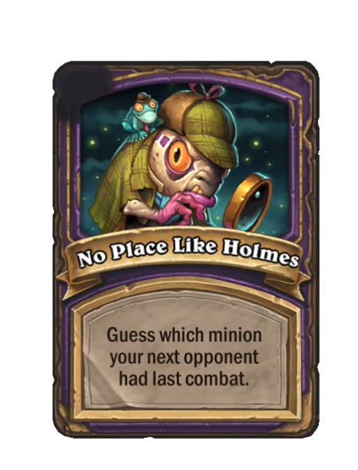 No Place Like Holmes is a Reward in Hearthstone Battlegrounds. Effect: Guess which minion your next opponent had last combat. This card is no longer in the pool (Legacy).