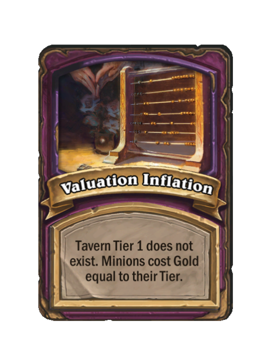 Valuation Inflation is a Anomaly in Hearthstone Battlegrounds. Effect: Tavern Tier 1 does not exist. Minions cost Gold equal to their Tier. This card is no longer in the pool (Legacy).