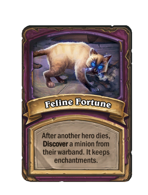 Feline Fortune is a Anomaly in Hearthstone Battlegrounds featuring Discover. Effect: After another hero dies, Discover a minion from their warband. It keeps enchantments. This card is no longer in the pool (Legacy).