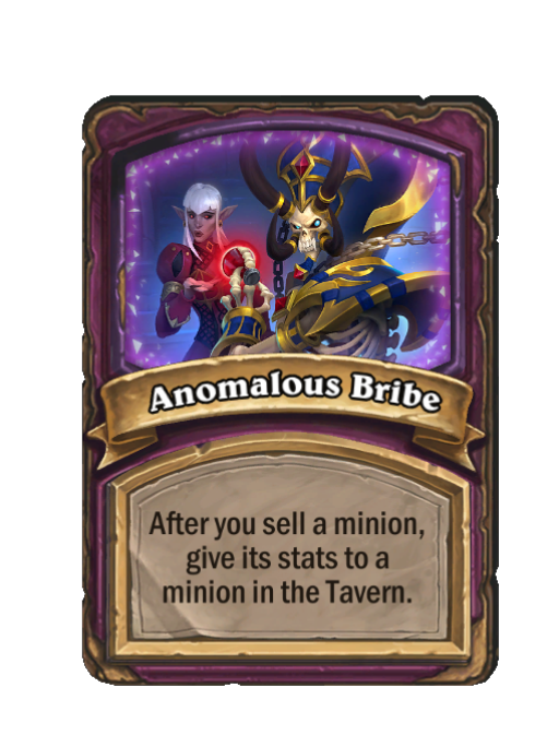 Anomalous Bribe is a Anomaly in Hearthstone Battlegrounds. Effect: After you sell a minion, give its stats to a minion in the Tavern. This card is no longer in the pool (Legacy).