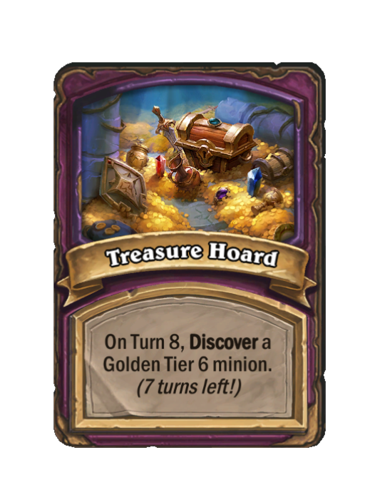 Treasure Hoard is a Anomaly in Hearthstone Battlegrounds featuring Discover. Effect: On Turn 8, Discover a Golden Tier 6 minion. (7 turns left!).