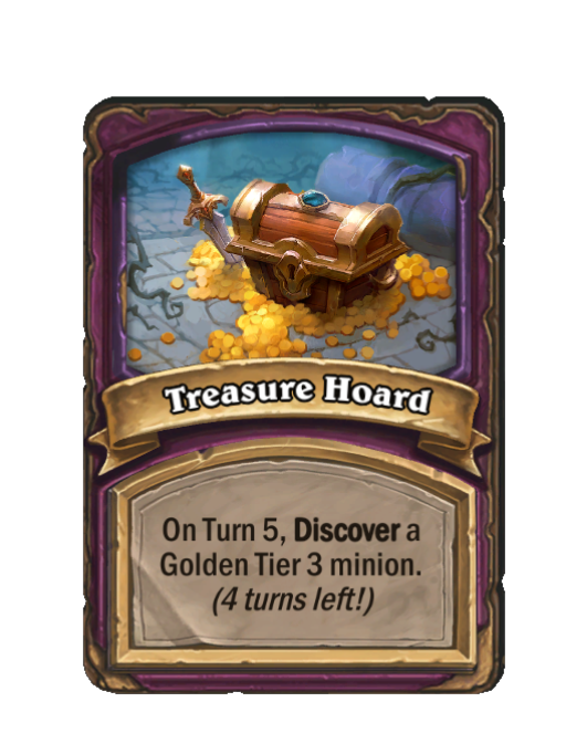 Treasure Hoard is a Anomaly in Hearthstone Battlegrounds featuring Discover. Effect: On Turn 5, Discover a Golden Tier 3 minion. (4 turns left!). This card is no longer in the pool (Legacy).