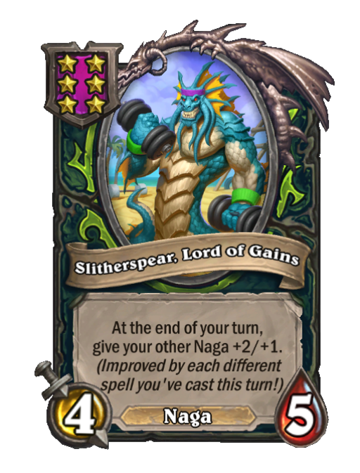 Slitherspear, Lord of Gains is a Tier 6 Naga Minion in Hearthstone Battlegrounds with 4/5 stats featuring End of Turn. Effect: At the end of your turn, give your other Naga +2/+1. (Improved by each different _____spell you've cast this turn!)___. This card is no longer in the pool (Legacy).
