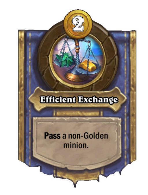 Efficient Exchange is a Hero Power in Hearthstone Battlegrounds featuring Pass. Effect: Pass a non-Golden minion. Costs 2 Gold. Created by: Madam Goya.
