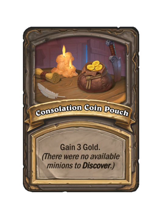 Consolation Coin Pouch is a Spell in Hearthstone Battlegrounds featuring Discover. Effect: Gain 3 Gold. (There were no available minions to Discover.). This card is no longer in the pool (Legacy).