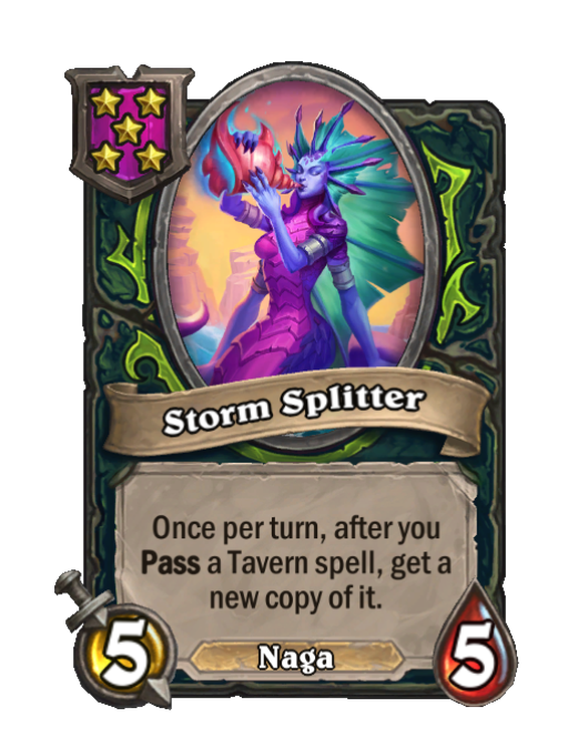 Storm Splitter is a Tier 5 Naga Minion in Hearthstone Battlegrounds with 5/5 stats. Effect: Once per turn, after you Pass a Tavern spell, get a new copy of it.