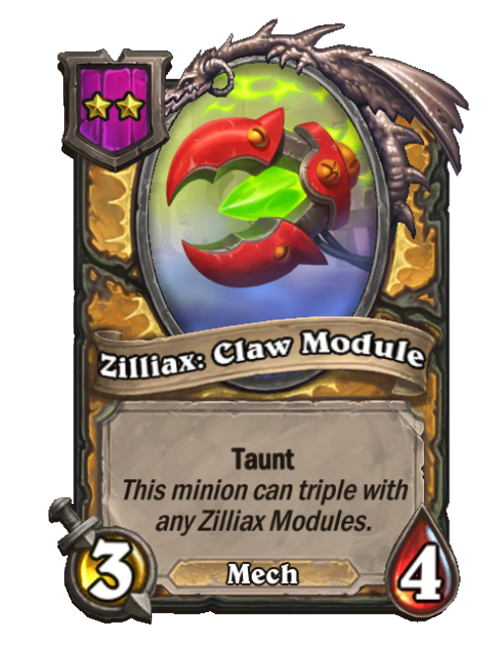 Zilliax: Claw Module is a Tier 2 Mech Minion in Hearthstone Battlegrounds with 3/4 stats featuring Taunt. Effect: Taunt This minion can triple with any Zilliax Modules. This card is no longer in the pool (Legacy).