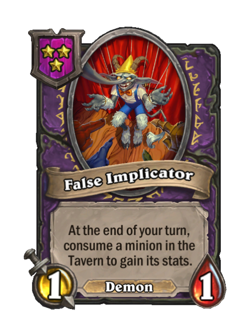 False Implicator is a Tier 3 Demon Minion in Hearthstone Battlegrounds with 1/1 stats featuring End of Turn. Effect: At the end of your turn, consume a minion in the _Tavern to gain its stats. This card is no longer in the pool (Legacy).