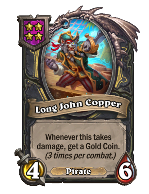 Long John Copper is a Tier 4 Pirate Minion in Hearthstone Battlegrounds with 4/6 stats. Effect: Whenever this takes damage, get a Gold Coin. (3 times per combat.). This card is no longer in the pool (Legacy).