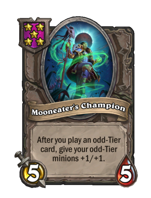 Mooneater's Champion is a Tier 5 Minion in Hearthstone Battlegrounds with 5/5 stats. Effect: After you play an odd-Tier card, give your odd-Tier minions +1/+1. This card is no longer in the pool (Legacy).