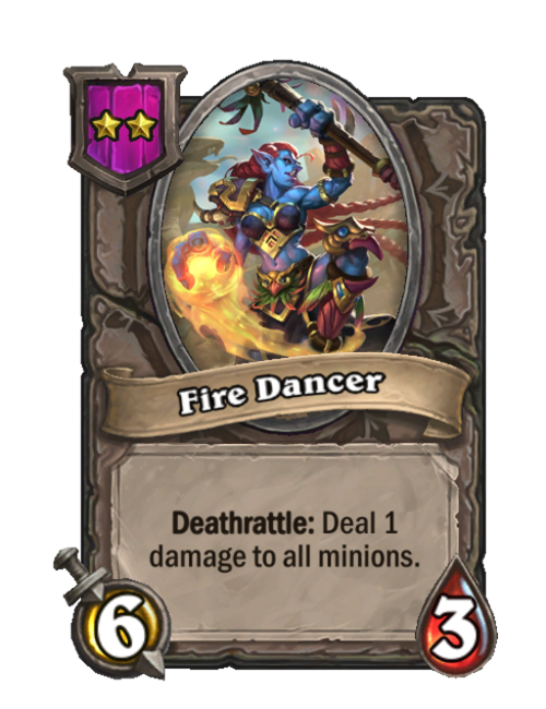 Fire Dancer is a Tier 2 Minion in Hearthstone Battlegrounds with 6/3 stats featuring Deathrattle. Effect: Deathrattle: Deal 1 damage to all minions. This card is no longer in the pool (Legacy).