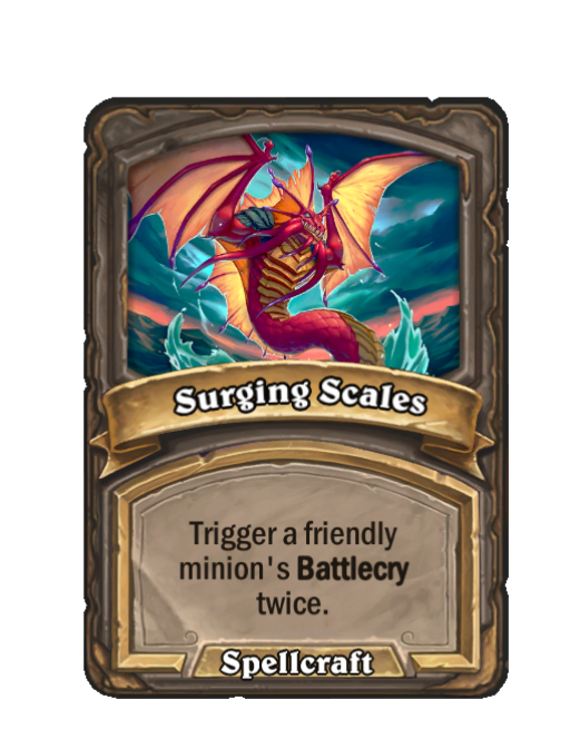 Surging Scales is a Spell in Hearthstone Battlegrounds (Spellcraft). Effect: Trigger a friendly minion's Battlecry twice. Created by: Draconic Deathscale. This card is no longer in the pool (Legacy).