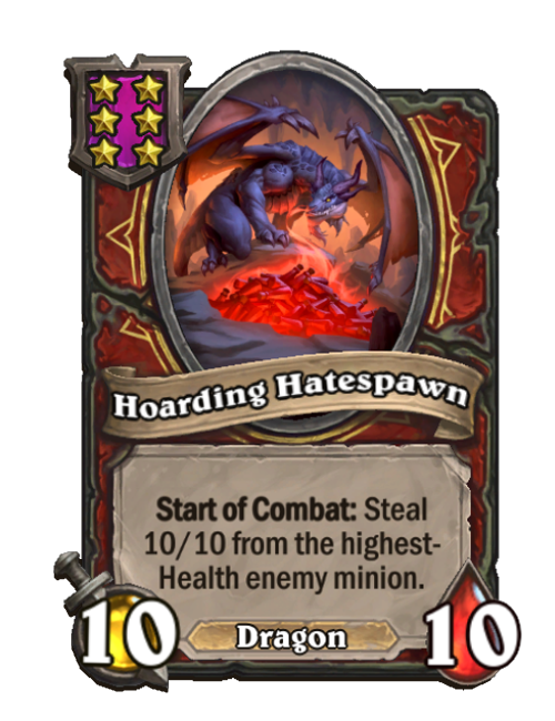 Hoarding Hatespawn is a Tier 6 Dragon Minion in Hearthstone Battlegrounds with 10/10 stats featuring Start of Combat. Effect: Start of Combat: Steal 10/10 from the highest- Health enemy minion. This card is no longer in the pool (Legacy).