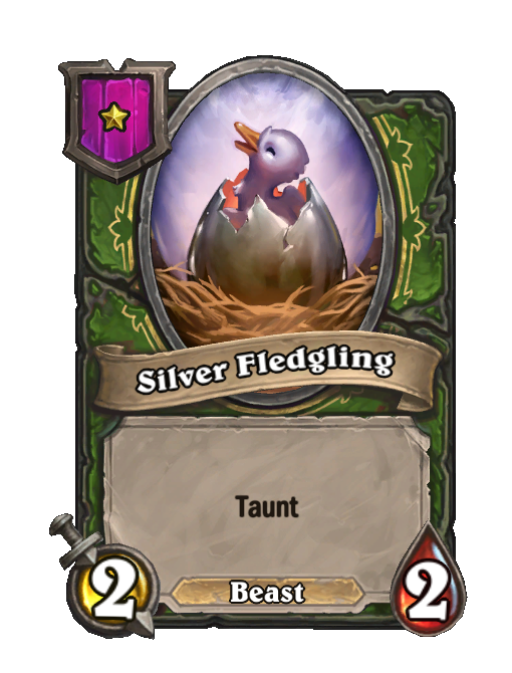 Silver Fledgling is a Tier 1 Beast Minion in Hearthstone Battlegrounds with 2/2 stats featuring Taunt. Effect: Taunt. Created by: Silver Goose. This card is no longer in the pool (Legacy).