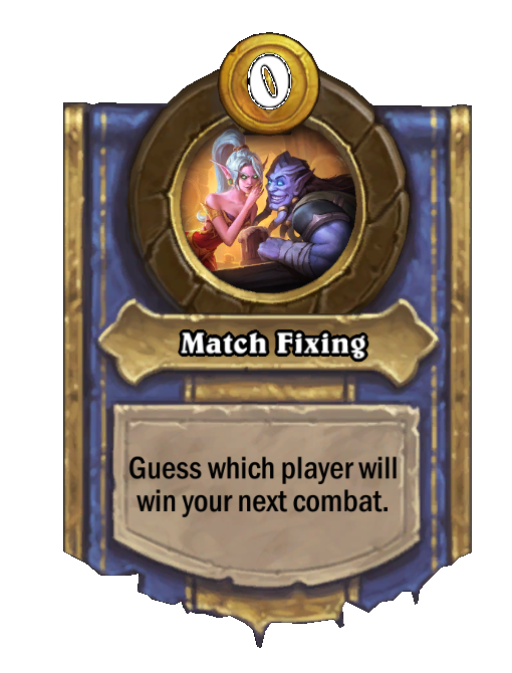 Match Fixing is a Hero Power in Hearthstone Battlegrounds. Effect: Guess which player will win your next combat. This card is no longer in the pool (Legacy).