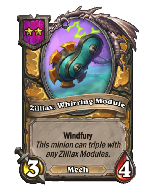 Zilliax: Whirring Module is a Tier 2 Mech Minion in Hearthstone Battlegrounds with 3/4 stats featuring Windfury. Effect: Windfury This minion can triple with any Zilliax Modules. This card is no longer in the pool (Legacy).